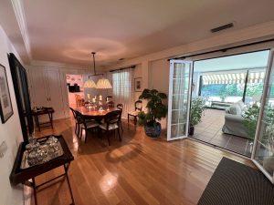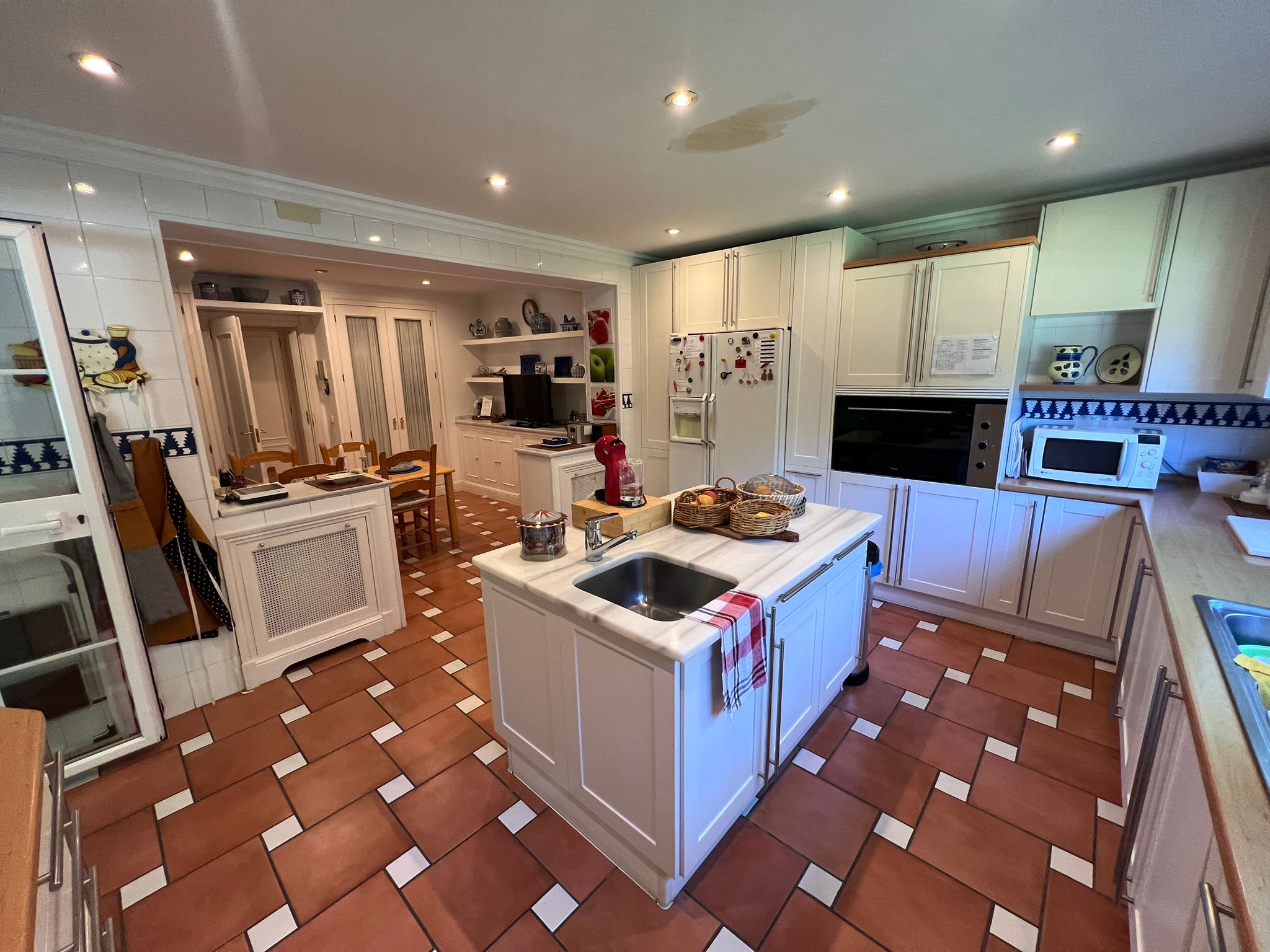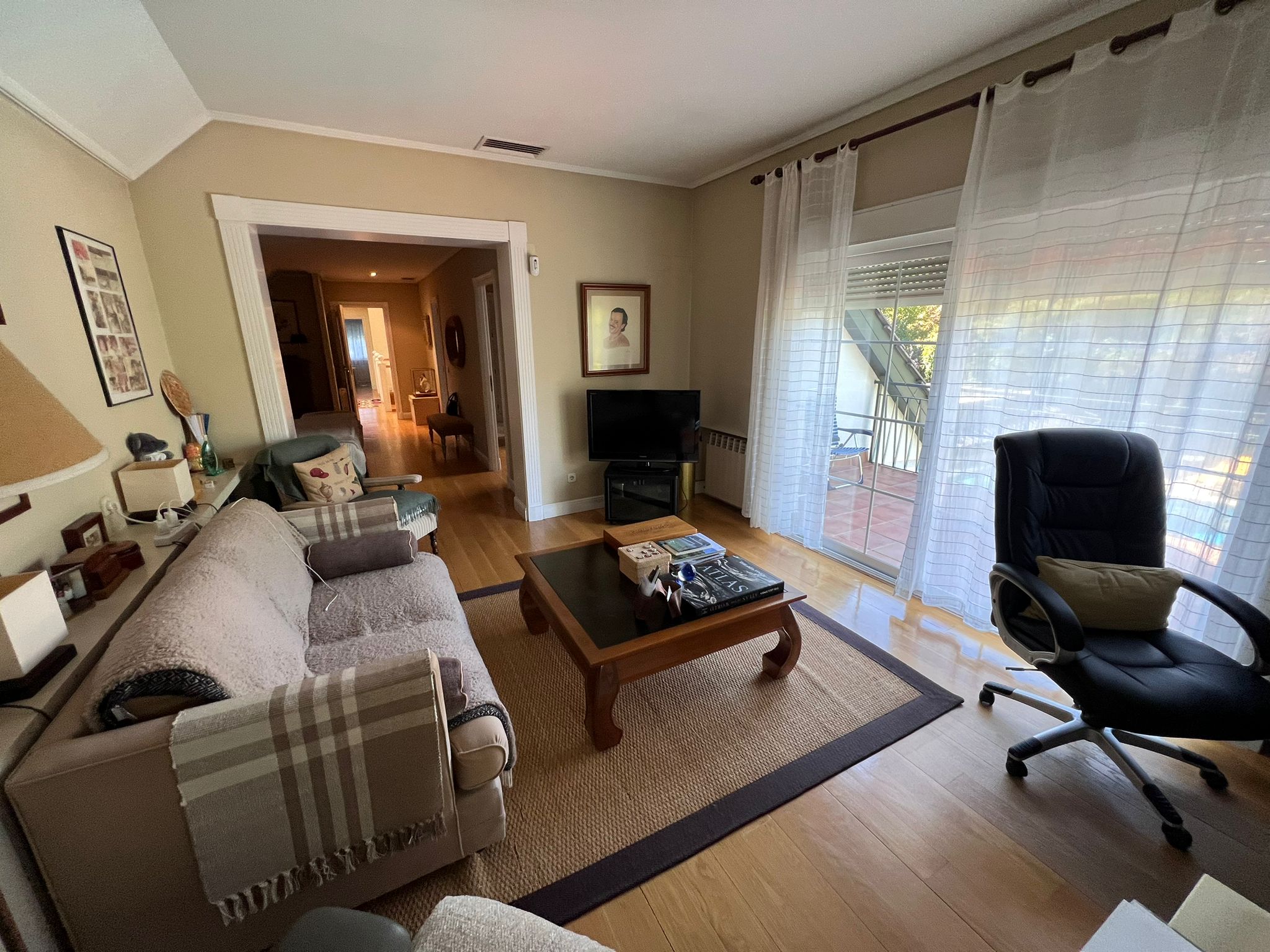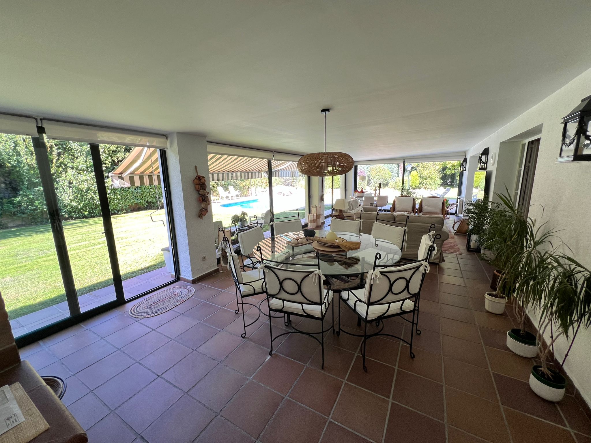 espacio acristalado que se abre directamente al jardín, inundando la estancia de luz natural y creando una conexión perfecta entre interior y exterior.Desde el comedor accedemos a una amplia cocina totalmente equipada, con espacio para office y acceso directo a la zona de servicio, que incluye dormitorio y baño completo.