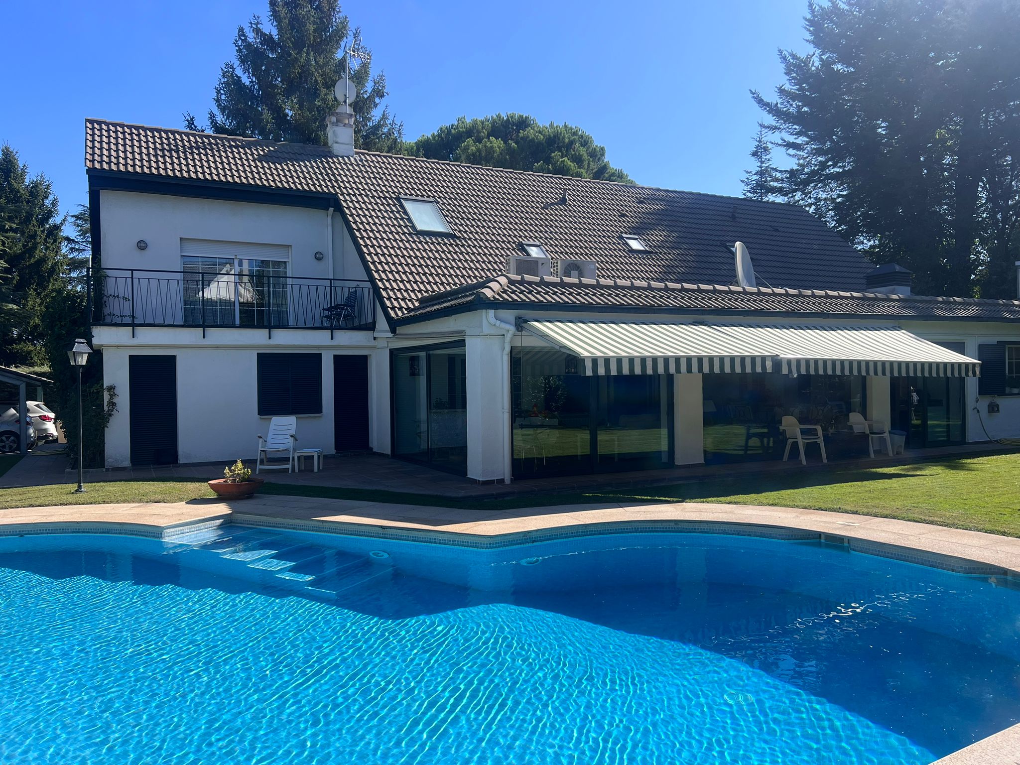 El exterior de la vivienda ofrece un cuidado jardín consolidado con piscina, amplias zonas verdes y distintos espacios de descanso y ocio que hacen de esta propiedad el lugar ideal para disfrutar del aire libre en un entorno exclusivo y seguro.